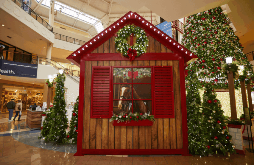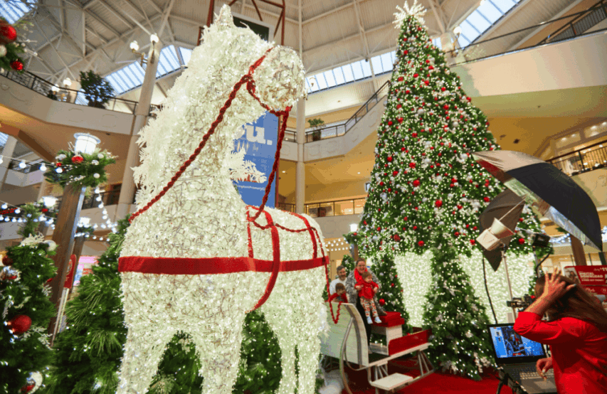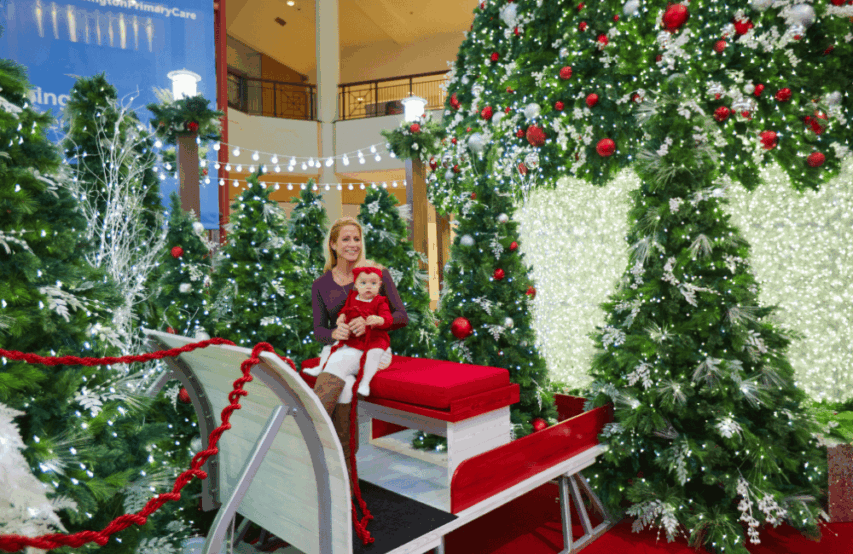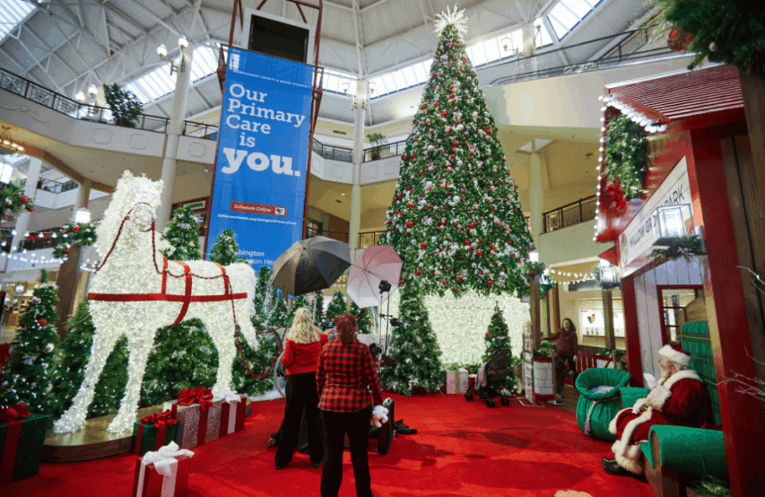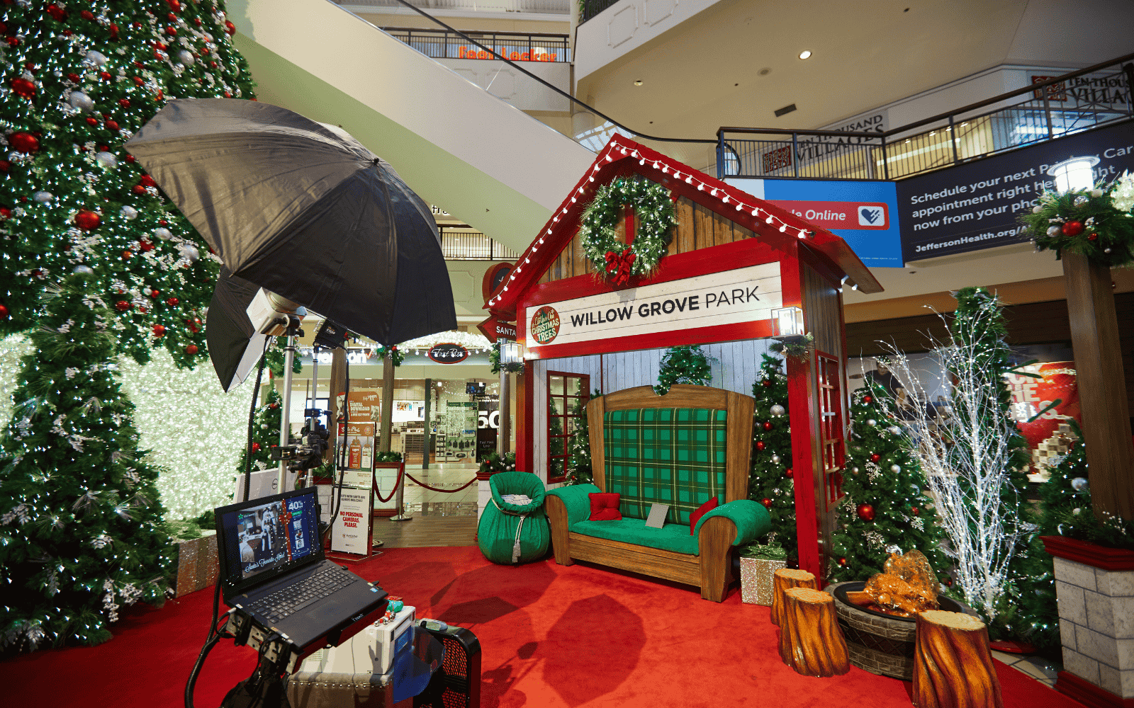 A holiday experience designed and produced by Studio Artefact for Willow Grove Park Mall in Willow Grove, Pennsylvania. Christmas trees and light sculptures illuminate the property, all the way to Santa's throne.